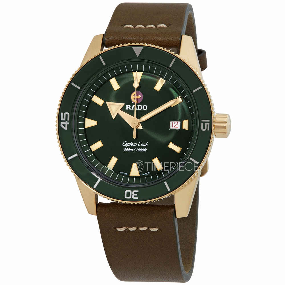 Bronze case with a green leather strap. Uni-directional rotating bronze with an inalid green ceramic ring bezel. Green dial with luminous rose gold-tone hands and index hour markers. Minute markers around the outer rim. Dial Type: Analog. Luminescent hands and markers. Date display at the 3 o'clock position. Automatic movement with an 80-hour power reserve. Scratch resistant sapphire crystal. Screw down crown. Solid case back. Round case shape, case size: 42 mm, case thickness: 12.5 mm. Tang clasp. Water resistant at 300 meters / 100 feet. Functions: date, hour, minute, second. Captain Cook Series. Casual watch style. Watch label: Swiss Made. Item Variations: 01.763.0504.3.131. Rado Captain Cook Automatic Green Dial Mens Watch R32504315.
