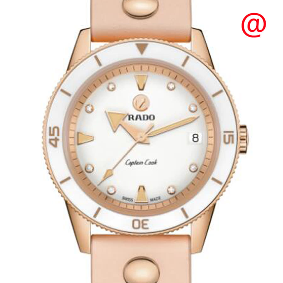Rose gold-tone stainless steel case with a beige leather strap. Uni-directional rotating white ceramic bezel. White dial with rose gold-tone hands and diamond hour markers. Minute markers around the outer rim. Dial Type: Analog. Date display at the 3 o'clock position. Automatic movement. Scratch resistant sapphire crystal. Solid case back. Round case shape, case size: 37 mm. Buckle clasp. Water resistant at 100 meters / 330 feet. Functions: date, hour, minute, second. Additional Info: original box, international warranty card, manual (complete accessories). Captain Cook Series. Luxury watch style. Watch label: Swiss Made. Rado Captain Cook Automatic Diamond White Dial Ladies Watch R32139708.