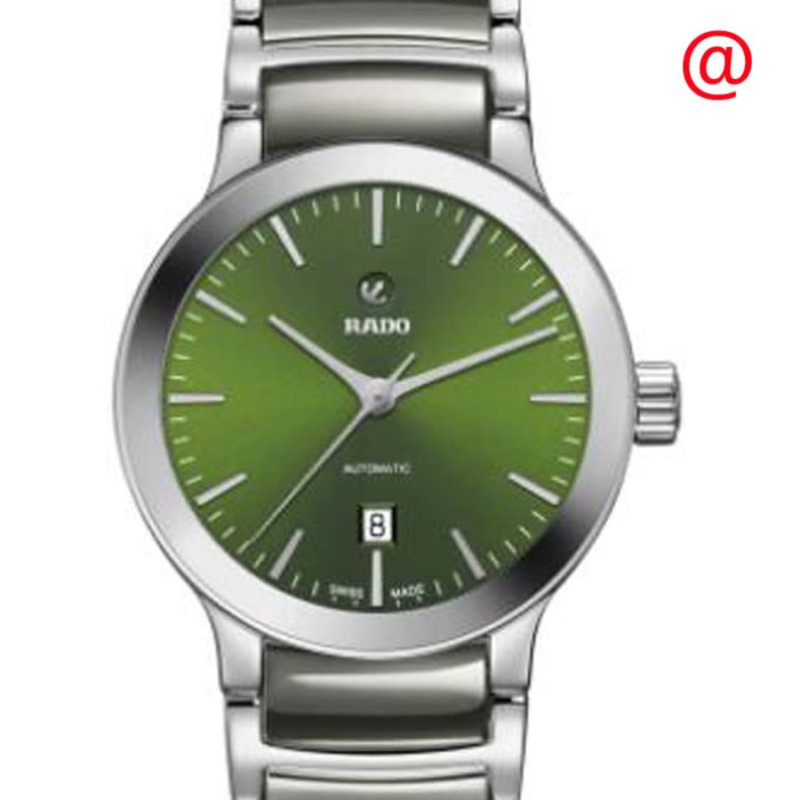 Silver-tone stainless steel case and bracelet. Fixed silver-tone stainless steel bezel. Green dial with silver-tone hands and index hour markers. Minute markers around the outer rim. Dial Type: Analog. Date display at the 6 o'clock position. Automatic movement. Scratch resistant sapphire crystal. Transparent see through case back. Round case shape, case size: 28 mm. Deployment with push button release clasp. Water resistant at 30 meters / 100 feet. Functions: date, hour, minute, second. Additional Info: original box, international warranty card, manual (complete accessories). Centrix Series. Luxury watch style. Watch label: Swiss Made. Rado Centrix Automatic Green Dial Ladies Watch R30011312.