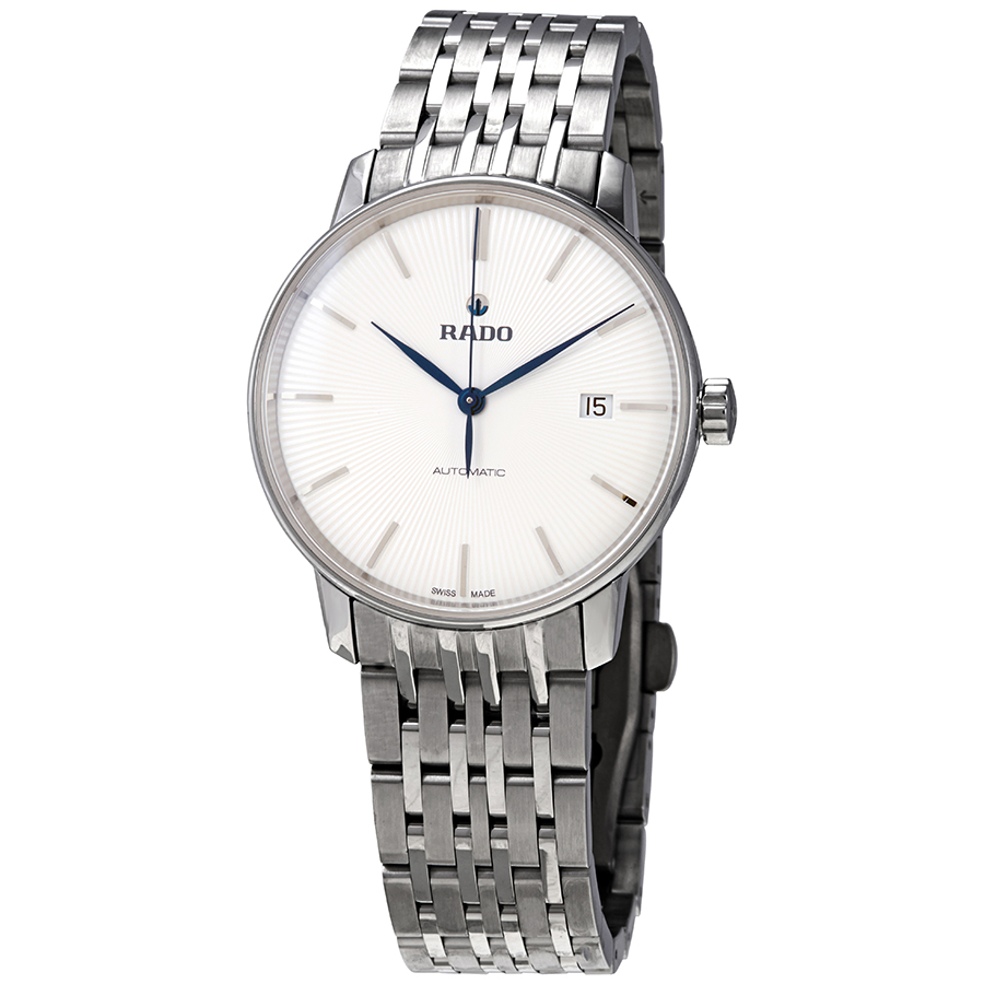 Silver-tone stainless steel case with a silver-tone stainless steel bracelet. Fixed silver-tone stainless steel bezel. Silver dial with blue hands and index hour markers. Dial Type: Analog. Date display at the 3 o'clock position. Automatic movement with an 80-hour power reserve. Scratch resistant sapphire crystal. Transparent case back. Round case shape, case size: 37.7 mm, case thickness: 10.2 mm. Fold over clasp. Water resistant at 50 meters / 165 feet. Functions: date, hour, minute, second. Casual watch style. Watch label: Swiss Made. Rado Coupole Classic Automatic Silver Dial Mens Watch R22860044.