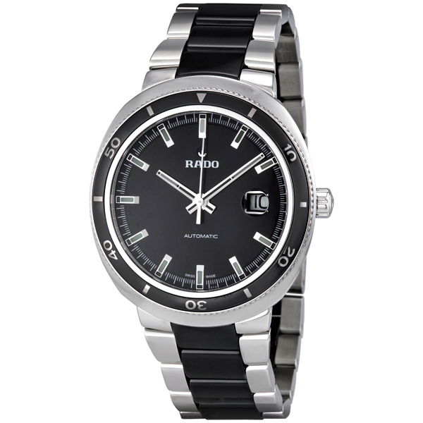Silver-tone stainless steel case with a two-tone (black and silver-tone) stainless steel with black cermaic center links bracelet. Uni-directional rotating black ceramic bezel. Black dial with silver-tone hands and index hour markers. Minute markers around the outer rim. Dial Type: Analog. Luminescent hands and markers. Date display at the 3 o'clock position. Automatic movement. Scratch resistant sapphire crystal. Screw down crown. Solid case back. Round case shape, case size: 40 mm, case thickness: 13 mm. Band width: 24 mm, band length: 8 inches. Deployment clasp. Water resistant at 200 meters / 660 feet. Functions: date, hour, minute, second. Casual watch style. Watch label: Swiss Made. Rado D Star Black Dial Stainless Steel Mens Watch R15959152.