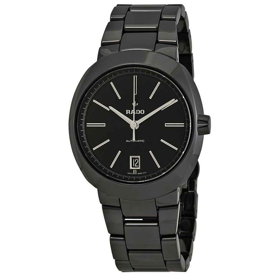 Black ceramic case with a black ceramic bracelet. Fixed black ceramic bezel. Black dial with silver-tone hands and index hour markers. Minute markers around the outer rim. Dial Type: Analog. Date display at the 6 o'clock position. Rado Calibre 658 (ETA 2824-2) automatic movement with a 38-hour power reserve. Scratch resistant sapphire crystal. Pull / push crown. Solid case back. Round case shape, case size: 38 mm, case thickness: 11 mm. Band width: 22 mm, band length: 7.5 inches. Titanium double folding clasp. Water resistant at 100 meters / 330 feet. Functions: date, hour, minute, second. Casual watch style. Watch label: Swiss Made. Rado D-Star Automatic Black Dial Mens Watch R15610172.