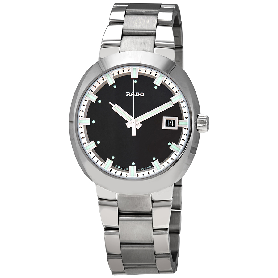 Silver-tone ceramos case with a stainless steel bracelet. Fixed silver-tone ceramos bezel. Black dial with luminous silver-tone hands and index hour markers. Minute markers around the outer rim. Dial Type: Analog. Luminescent hands and markers. Date display at the 3 o'clock position. Quartz movement. Scratch resistant sapphire crystal. Solid case back. Round case shape. Case size: 42 mm. Case thickness: 9 mm. Band width: 22 mm. Band length: 8 inches. Deployment clasp. Water resistant at 100 meters / 330 feet. Functions: date, hour, minute, second. Additional Info: ceramos is made of high-tech ceramic and a metal composite. D-star Series. Casual watch style. Watch label: Swiss Made. Rado D-Star Quartz Black Dial Mens Watch R15945163.