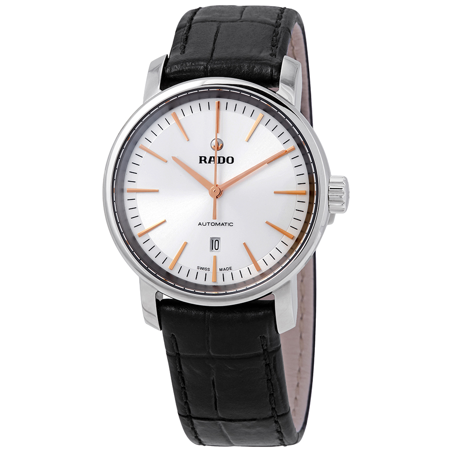 Stainless steel case with a black leather strap. Fixed stainless steel bezel. Silver dial with rose gold-tone hands and index hour markers. Minute markers around the outer rim. Dial Type: Analog. Date display above the 6 o'clock position. Rado calibre 580 (ETA 2681) automatic movement, based upon ETA 2681, containing 25 Jewels, bitting at 28800 vph, and has a power reserve of approximately 38 hours. Scratch resistant sapphire crystal. Pull / push crown. Transparent case back. Round case shape. Case size: 33 mm. Case thickness: 9.6 mm. Band width: 17 mm. Band length: 6.5 inches. Fold over clasp. Water resistant at 50 meters / 165 feet. Functions: date, hour, minute, second. Diamaster Series. Casual watch style. Watch label: Swiss Made. Rado DiaMaster Automatic Silver Dial Ladies Leather Watch R14050105.