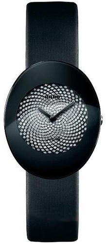 Black PVD stainless steel case with a black satin strap. Fixed black PVD bezel. Black (diamond pave) dial with black hands. No markers. Dial Type: Analog. Quartz movement. Scratch resistant sapphire crystal. Pull / push crown. Solid case back. Oval case shape. Case size: 33 mm. Tang clasp. Water resistant at 30 meters / 100 feet. Functions: hour, minute. Esenza Series. Dress watch style. Watch label: Swiss Made. Rado Esenza Quartz Diamond Pave Black Dial Ladies Watch R53414706.
