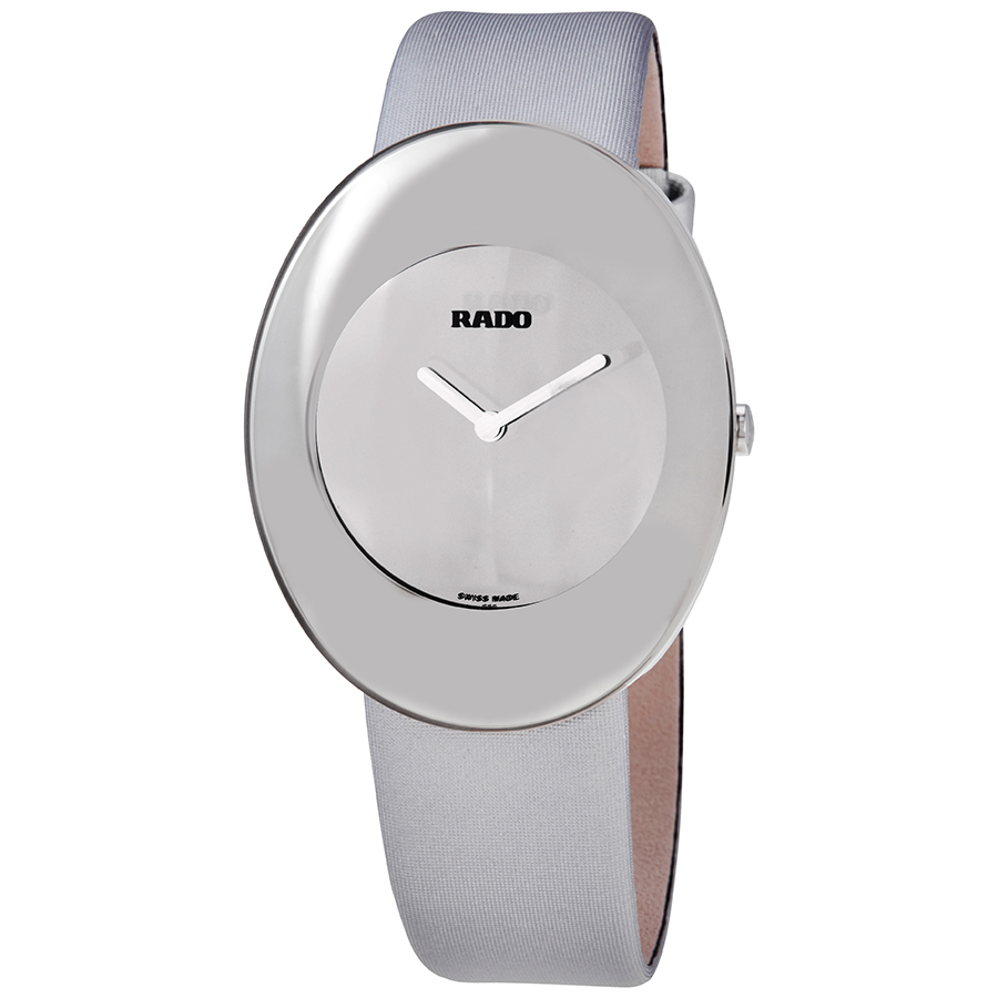 Silver-tone stainless steel case with a silver-tone satin over leather strap. Fixed silver-tone stainless steel bezel. Silver-tone dial with silver-tone hands. Dial Type: Analog. Quartz movement. Scratch resistant sapphire crystal. Pull / push crown. Solid case back. Oval case shape, case size: 33 mm, case thickness: 8 mm. Band width: 17 mm, band length: 7 inches. Buckle clasp. Water resistant at 30 meters / 100 feet. Functions: hour, minute. Luxury watch style. Watch label: Swiss Made. Rado Esenza Quartz Silver Dial Ladies Watch R53739306.