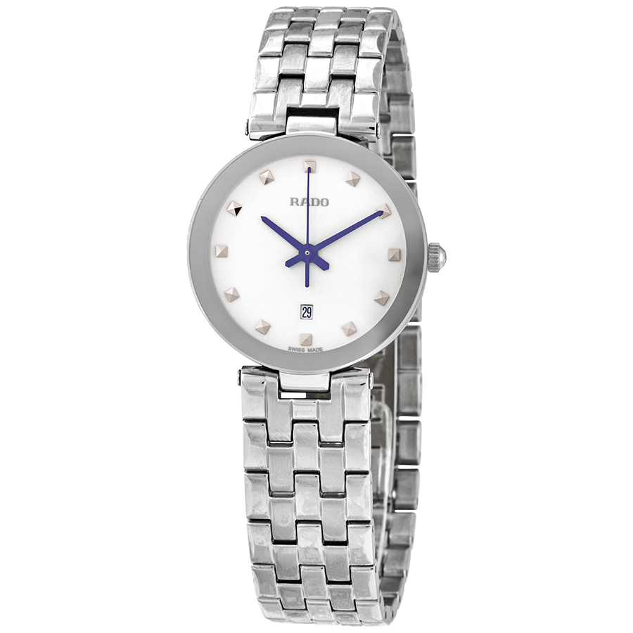 Silver-tone stainless steel case with a stainless steel bracelet. Fixed bezel. Blue hands. Dial Type: Analog. Date display at the 6 o'clock position. Quartz movement. Scratch resistant sapphire crystal. Pull / push crown. Round case shape, case size: 28 mm, case thickness: 6.3 mm. Water resistant at 30 meters / 100 feet. Functions: date, hour, minute, second. Dress watch style. Watch label: Swiss Made. Rado Florence Quartz Ladies Watch R48874024.
