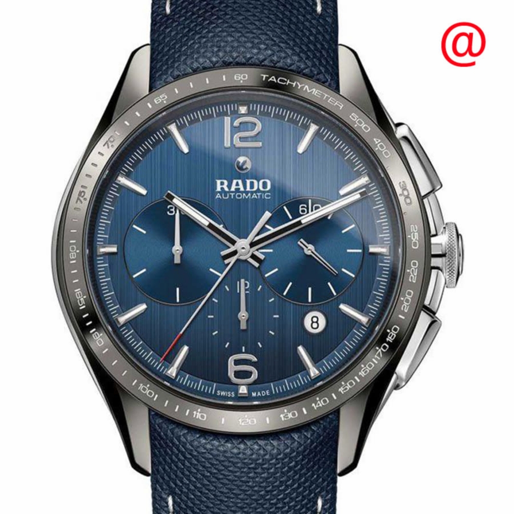 Black ceramic case with a blue leather strap. Fixed tachymeter scale black ceramic bezel. Blue dial with silver-tone hands and index hour markers. Minute markers around the outer rim. Dial Type: Analog. Luminescent hands and markers. Date display between 4 and 5 o'clock position. Automatic movement. Scratch resistant sapphire crystal. Round case shape, case size: 45 mm. Functions: chronograph, date, hour, minute, second. Additional Info: original box, international warranty card, manual (complete accessories). Hyperchrome Series. Luxury watch style. Watch label: Swiss Made. Rado Hyperchrome Chronograph Automatic Blue Dial Mens Watch R32120205.