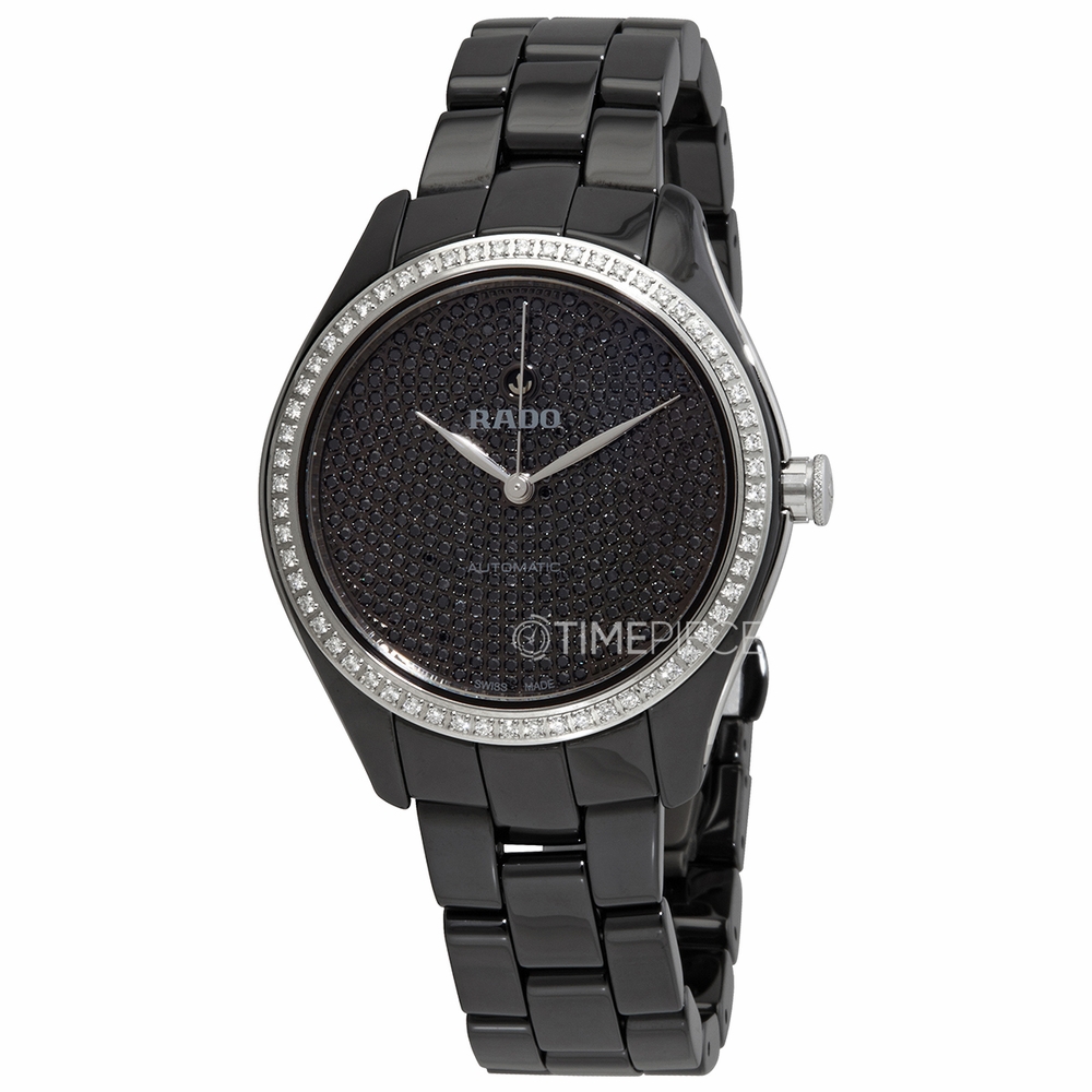 Black (high-tech) ceramic case with a (high-tech) ceramic bracelet with black PVD titanium links. Fixed stainless steel bezel set with diamonds. Black (gemstone-set) dial with silver-tone hands. No markers. Dial Type: Analog. Automatic movement. Scratch resistant sapphire crystal. Pull / push crown. Solid case back. Round case shape. Case size: 36 mm. Case thickness: 10.5 mm. Fold over clasp. Water resistant at 50 meters / 165 feet. Functions: hour, minute, second. Hyperchrome Series. Dress watch style. Rado Hyperchrome Automatic Diamond Black Dial Ladies Watch R32482722.