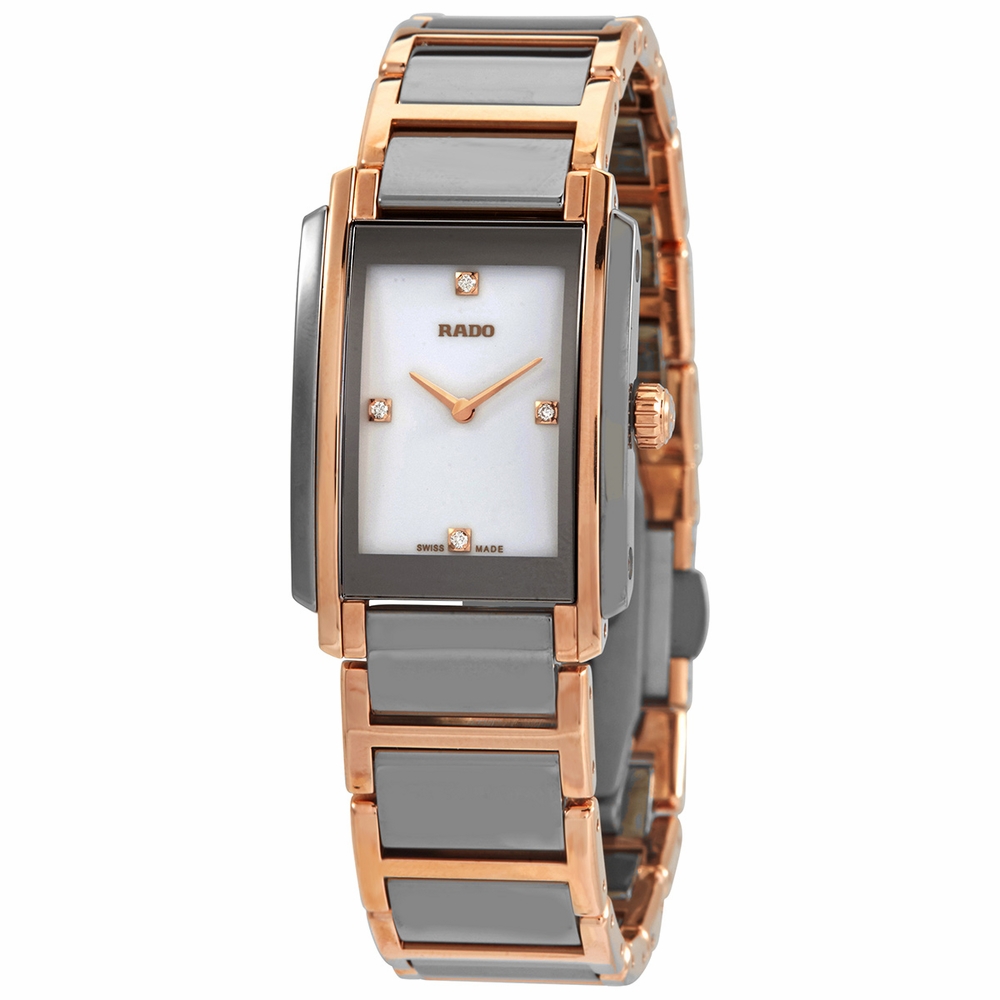 Grey (high-tech) ceramic case with a rose gold PVD stainless steel bracelet with grey (high-tech) ceramic inserts. Fixed grey (high-tech) ceramic bezel with rose gold PVD accents. Whitre dial with rose gold-tone hands. Diamonds set at the 3, 6, 9 and 12 o'clock positions. Dial Type: Analog. ETA caliber E61.111 quartz movement. Scratch resistant sapphire crystal. Pull / push crown. Solid case back. Rectangle case shape. Case size: 22.7 mm. Case thickness: 6.5 mm. Fold over clasp with a push button release. Water resistant at 30 meters / 100 feet. Functions: hour, minute. Integral Diamonds Series. Dress watch style. Watch label: Swiss Made. Rado Integral Diamonds Quartz White Dial Ladies Watch R20141712.