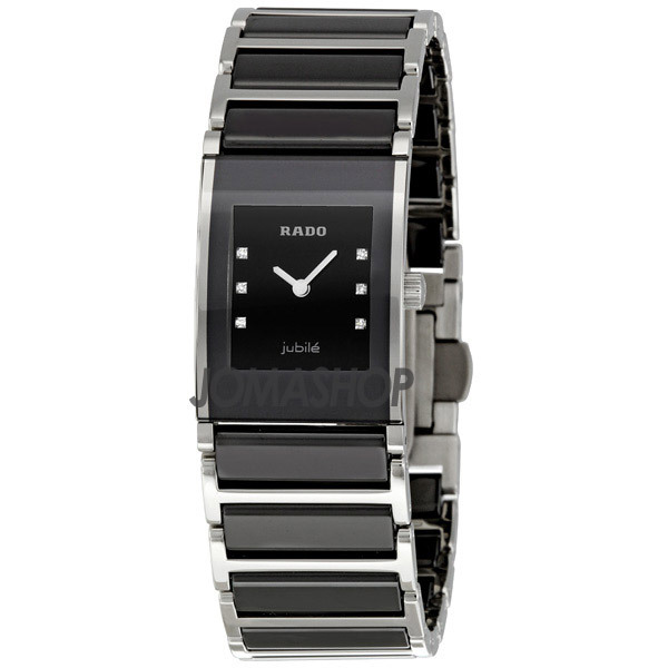 Stainless steel case with a stainless steel bracelet with black ceramic inserts. Fixed black ceramic bezel. Black (diamond-set) dial with silver-tone hands. The Rado name appears at the 12 o'clock position. Dial Type: Analog. Luminescent hands. Quartz movement. Scratch resistant sapphire crystal. Pull / push crown. Solid case back. Rectangle case shape. Case dimensions: 30.5 mm x 24 mm. Case thickness: 6.8 mm. Band width: 18 mm. Fold over clasp with a double push button release. Water resistant at 30 meters / 100 feet. Functions: hours, minutes. Dress watch style. Rado Integral Jubile Black Ceramic Ladies Watch R20786752.