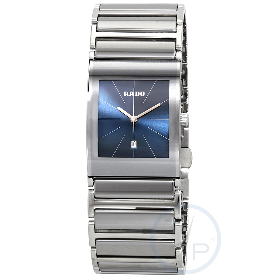 Stainless steel case with a stainless steel bracelet with ceramos inserts. Fixedstainless steel bezel. Blue dial with silver-tone hands and index hour markers. Dial Type: Analog. Date display at the 6 o'clock position. Rado calibre 152 quartz movement. Scratch resistant sapphire crystal. Pull / push crown. Solid case back. Square case shape. Case dimensions: 40 mm x 27mm. Case thickness: 8 mm. Band width: 27 mm. Band length: 7.5 inches. Titanium double fold over clasp. Water resistant at 30 meters / 100 feet. Functions: date, hour, minute, second. Casual watch style. Watch label: Swiss Made. Rado Integral Quartz Blue Dial Mens Watch R20745202.