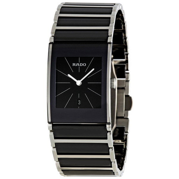 Two-tone (black and silver-tone) black ceramic with stainless steel trim case with a two-tone (black and silver-tone) black ceramic with stainless steel trim bracelet. Fixed two-tone (black and silver-tone) ceramic bezel. Black dial with silver-tone hands and index hour markers. The rado name appears below the 12 o'clock position. Dial Type: Analog. Date display at the 6 o'clock position. Quartz movement. Scratch resistant sapphire crystal. Pull / push crown. Solid case back. Rectangle case shape. Case size: 31 mm x 28 mm. Hidden push button deployment clasp. Water resistant at 30 meters / 100 feet. Functions: hours, minutes, date. Dress watch style. Watch label: Swiss. Rado Integral Black Dial Ceramic Stainless Ladies Watch R20785152.