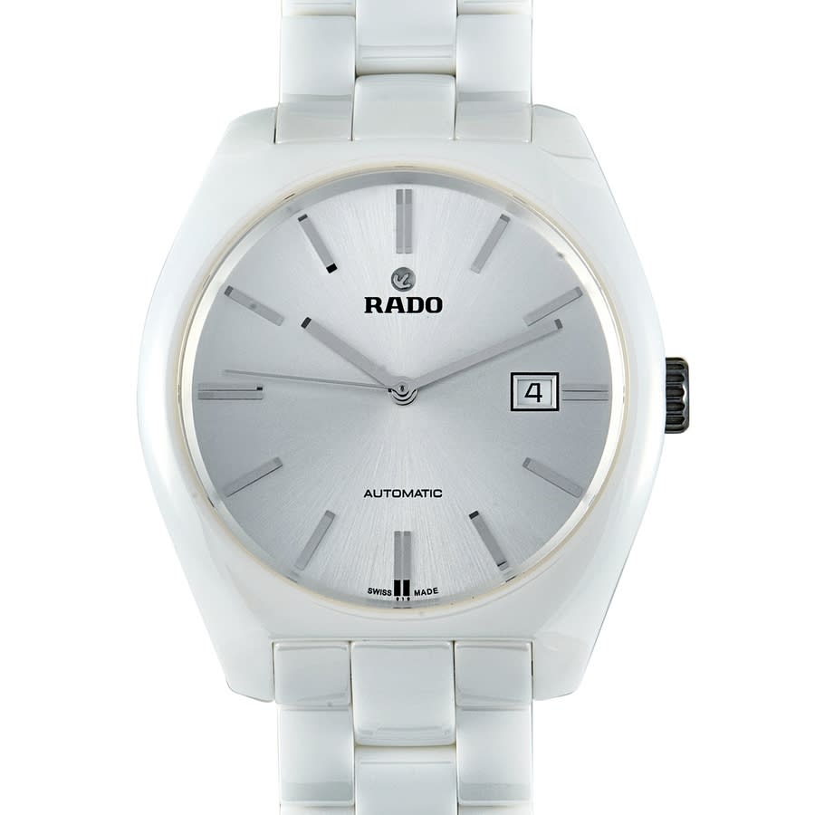 White ceramic case with a white ceramic 1bracelet. Fixed white ceramic bezel. Silver dial with silver-tone hands and index hour markers. Dial Type: Analog. Date display at the 3 o'clock position. Caliber 239 automatic movement. Scratch resistant sapphire crystal. Pull / push crown. Transparent case back. Round case shape. Case size: 40 mm. Case thickness: 76 mm. Bracelet width: 20 mm. Deployment clasp with a push button release. Water resistant at 30 meters / 100 feet. Functions: date, hour, minute, second. Montres Series. Luxury watch style. Watch label: Swiss Made. Rado Montres Automatic Silver Dial Mens Watch R31507107/01.629.0507.3.210.