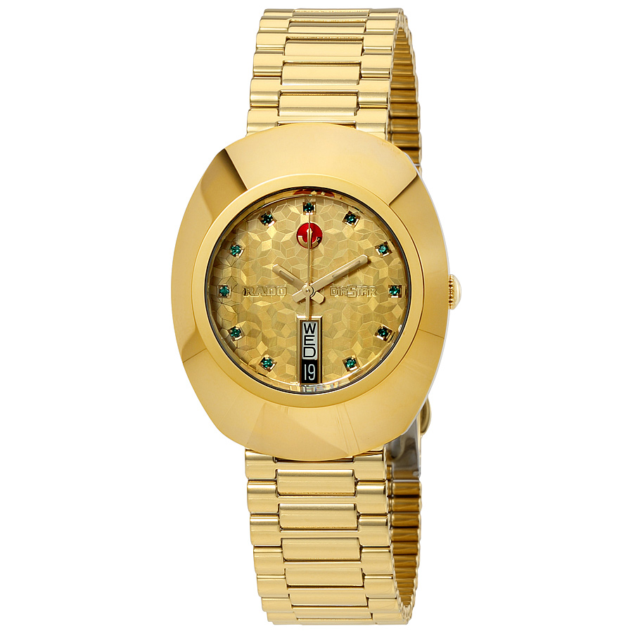 Yellow gold CVD stainless steel case with a yellow gold PVD stainless steel bracelet. Fixed yellow gold PVD bezel. Yellow gold dial with luminous yellow gold-tone hands and green simili stones hour markers. Dial Type: Analog. Luminescent hands. Day of the week and date display at the 6 o'clock position. ETA caliber 2636-2 automatic movement with a 55-hour power reserve. Scratch resistant sapphire crystal. Pull / push crown. Solid case back. Oval case shape, case size: 35 mm, case thickness: 11.9 mm. Deployment clasp. Water resistant at 30 meters / 100 feet. Functions: date, day, hour, minute, second. Casual watch style. Rado Original Automatic Yellow Gold Dial Mens Watch R12413663.