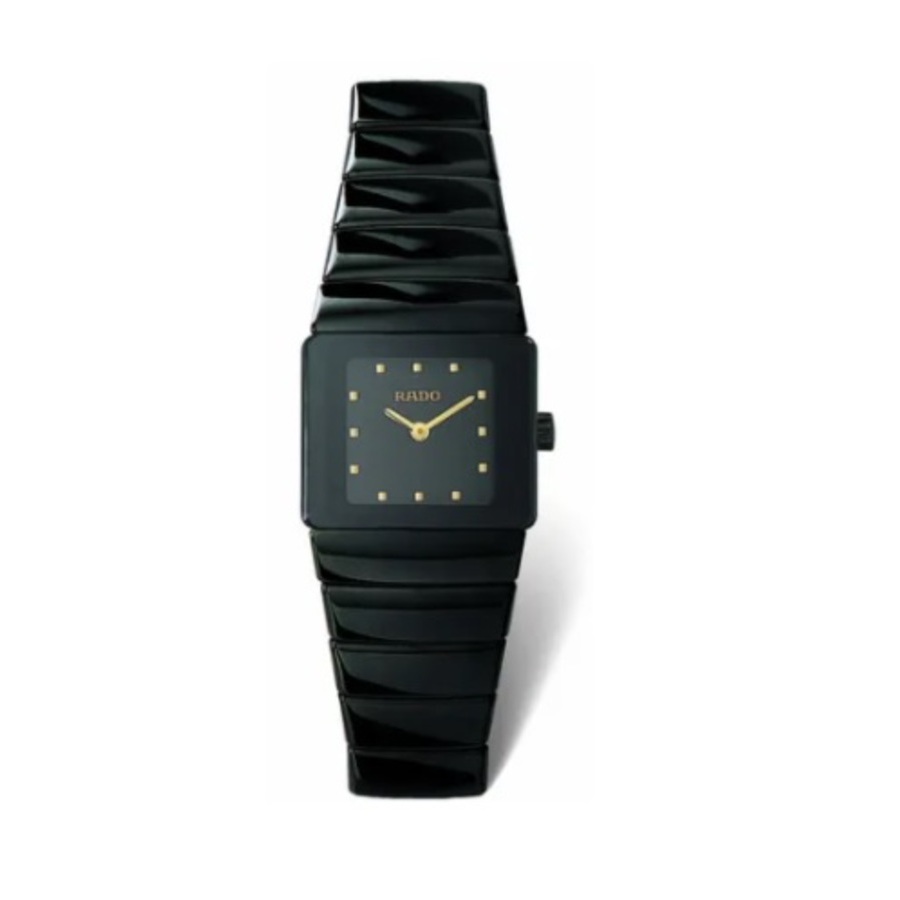 Black ceramic case with a black ceramic bracelet. Fixed bezel. Black dial with gold-tone hands and dot hour markers. Quartz movement. Scratch resistant sapphire crystal. Solid case back. Case dimensions: 21 mm x 17 mm. Hidden push button deployment clasp. Water resistant at 30 meters / 100 feet. Functions: hours, minutes. Rado Sintra Ladies Watch R13337162.