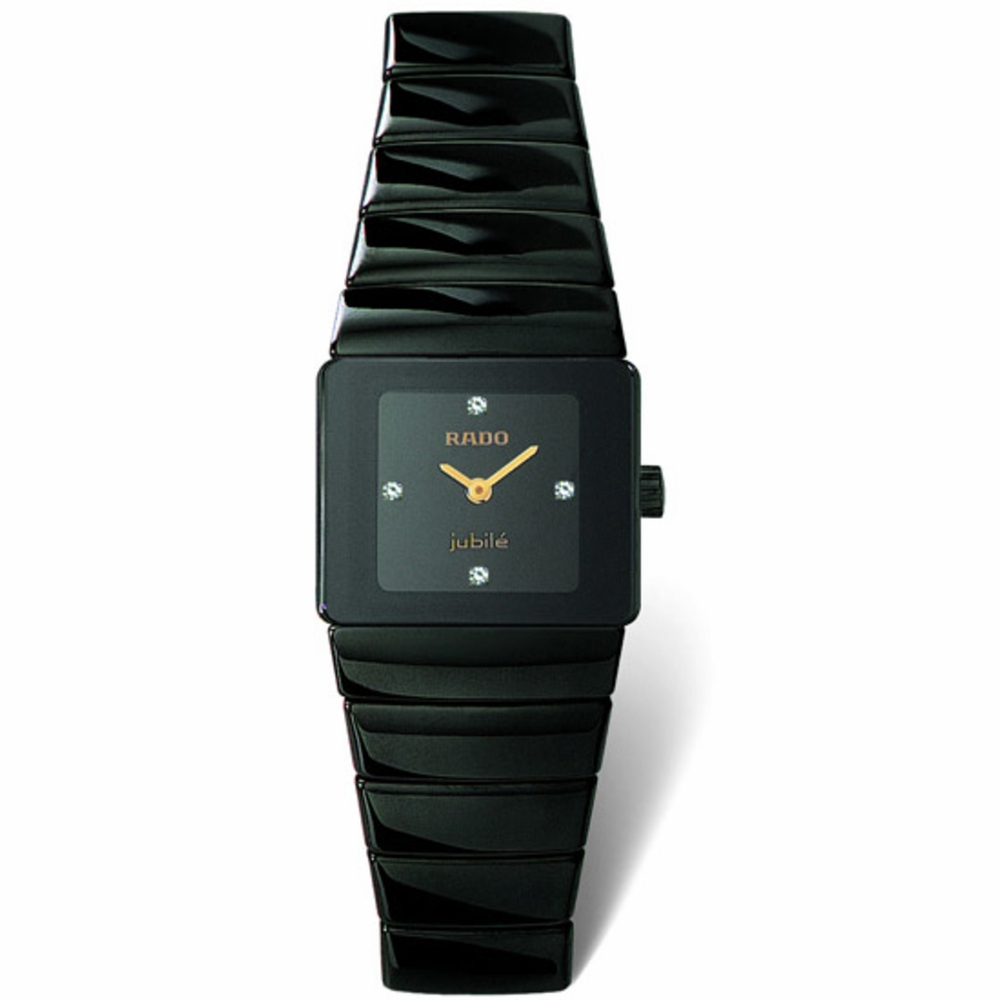 Black ceramic case with a black ceramic bracelet. Fixed bezel. Black dial with gold-tone hands and 4 diamond hour markers. Dial Type: Analog. Quartz movement. Scratch resistant sapphire crystal. Solid case back. Case diameter: 21mm x 17mm. Hidden push button deployment clasp. Water resistant at 30 meters / 100 feet. Functions: hour, minute. Additional Info: diamond rado watch. scratch resistant watch.. Dress watch style. Rado Sintra Jubile Ladies Watch R13337722.