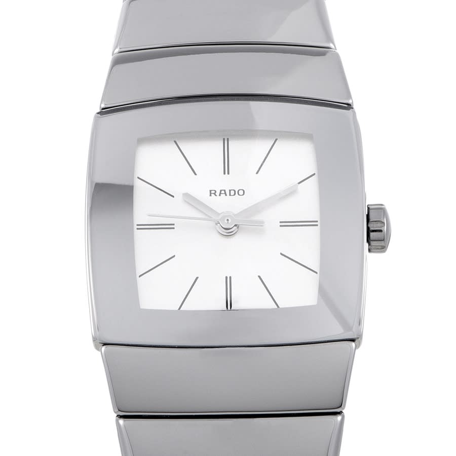 Silver-tone ceramic case and bracelet. Fixed silver-tone ceramic bezel. White dial with silver-tone hands and index hour markers. Dial Type: Analog. Quartz movement. Scratch resistant sapphire crystal. Pull / push crown. Solid case back. Square case shape. Case size: 22 mm. Fold over clasp with a push button release. Water resistant at 30 meters / 100 feet. Functions: hour, minute, second. Montres Sintra Series. Luxury watch style. Rado Montres Sintra Quartz White Dial Ladies Watch R13722122/01.318.0722.3.012.