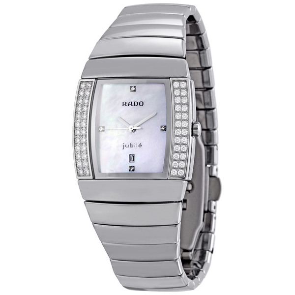 Platinum-tone ceramic case with a platinum-tone ceramic bracelet. Fixed platinum-tone ceramic bezel set with 48 diamonds. Mother of pearl dial with silver-tone hands. Diamonds set at the 3, 6, 9 and 12 o'clock position. rado name appears below the 12 o'clock position. Dial Type: Analog. Date display at the 6 o'clock position. Rado calibre 152 quartz movement. Scratch resistant sapphire crystal. Pull / push crown. Solid case back. Tonneau case shape. Case dimensions: 29 mm x 25 mm. Case thickness: 8 mm. Band width: 22 mm. Band length: 7 inches. Deployment clasp. Water resistant at 30 meters / 100 feet. Functions: date, hour, minute, second. Sintra Super Jubile Series. Dress watch style. Watch label: Swiss Made. Rado Sintra Super Jubile Mother of Pearl Dial Ladies Watch R13577902.