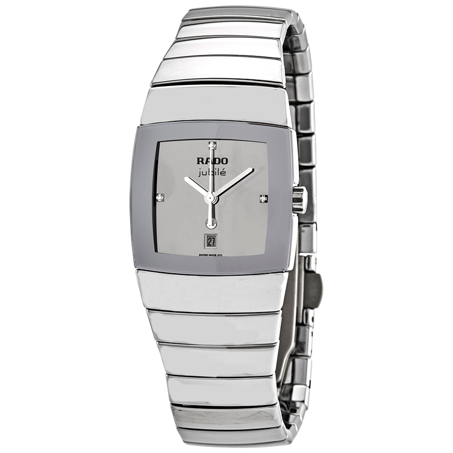 Plasma high-tech ceramos case with a plasma high-tech ceramos band. Fixed plasma ceramos bezel. Silver dial with silver-tone hands. Diamonds set at the 3, 9 and 12 o'clock positions. Dial Type: Analog. Date display at the 6 o'clock position. Quartz movement. Scratch resistant sapphire crystal. Pull / push crown. Solid case back. Square case shape. Case dimensions: 27 mm x 36 mm. Case thickness: 12 mm. Band width: 21 mm. Fold over clasp. Water resistant at 30 meters / 100 feet. Functions: date, hour, minute, second. Dress watch style. Watch label: Swiss Made. Rado Sintra Silver Diamond Dial Ladies Watch R13855702.