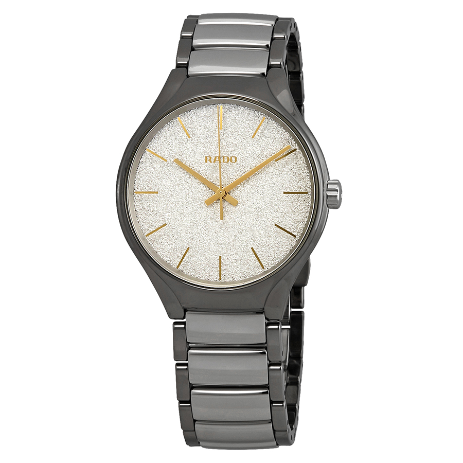 Grey plasma high-tech ceramic, stainless steel case with a grey plasma high-tech ceramic, stainless steel bracelet. Fixed grey bezel. Metallic silver glitter dial with gold-tone hands and index hour markers. Dial Type: Analog. Rado Calibre 763 (ETA C07.611) automatic movement with an 80-hour power reserve. Scratch resistant sapphire crystal. Transparent case back. Round case shape, case size: 40 mm, case thickness: 10.5 mm. Butterfly clasp. Water resistant at 50 meters / 165 feet. Functions: hour, minute, second. Additional Info: limited edition of 1001 pieces. Casual watch style. Watch label: Swiss Made. Rado True Blaze Metallic Silver Glitter Dial Mens Limited Edition Watch R27057092.