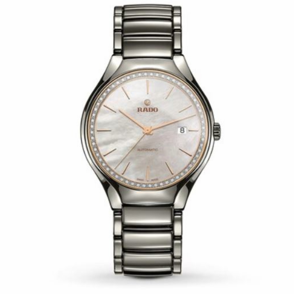 Plasma (high-tech) ceramic case and bracelet. Fixed plasma (high-tech) ceramic bezel set with diamonds. Mother of pearl dial with rose gold-tone hands and index hour markers. Dial Type: Analog. Date display at the 3 o'clock position. Automatic movement with an 80-hour power reserve. Scratch resistant sapphire crystal. Pull / push crown. Solid case back. Round case shape. Case size: 40.0 mm. Case thickness: 10.4 mm. Band width: 18 mm. Deployment clasp. Water resistant at 50 meters / 165 feet. Functions: date, hour, minute, second. True Series. Dress watch style. Watch label: Swiss Made. Rado True Automatic Mother of Pearl Dial Ladies Watch R27057852.