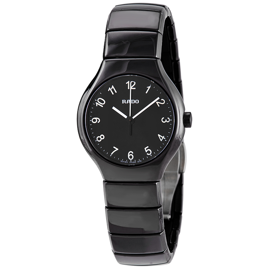 Black ceramic case with a black ceramic bracelet. Fixed black ceramic bezel. Black dial with silver-tone hands and Arabic numeral hour markers. Minute markers around the outer rim. Dial Type: Analog. Quartz movement. Scratch resistant sapphire crystal. Pull / push crown. Solid case back. Round case shape, case size: 27 mm, case thickness: 8 mm. Band width: 14 mm, band length: 6.5 inches. Titanium double folding clasp. Water resistant at 30 meters / 100 feet. Functions: hour, minute, second. Casual watch style. Watch label: Swiss Made. Rado True Quartz Black Dial Ladies Watch R27655192.