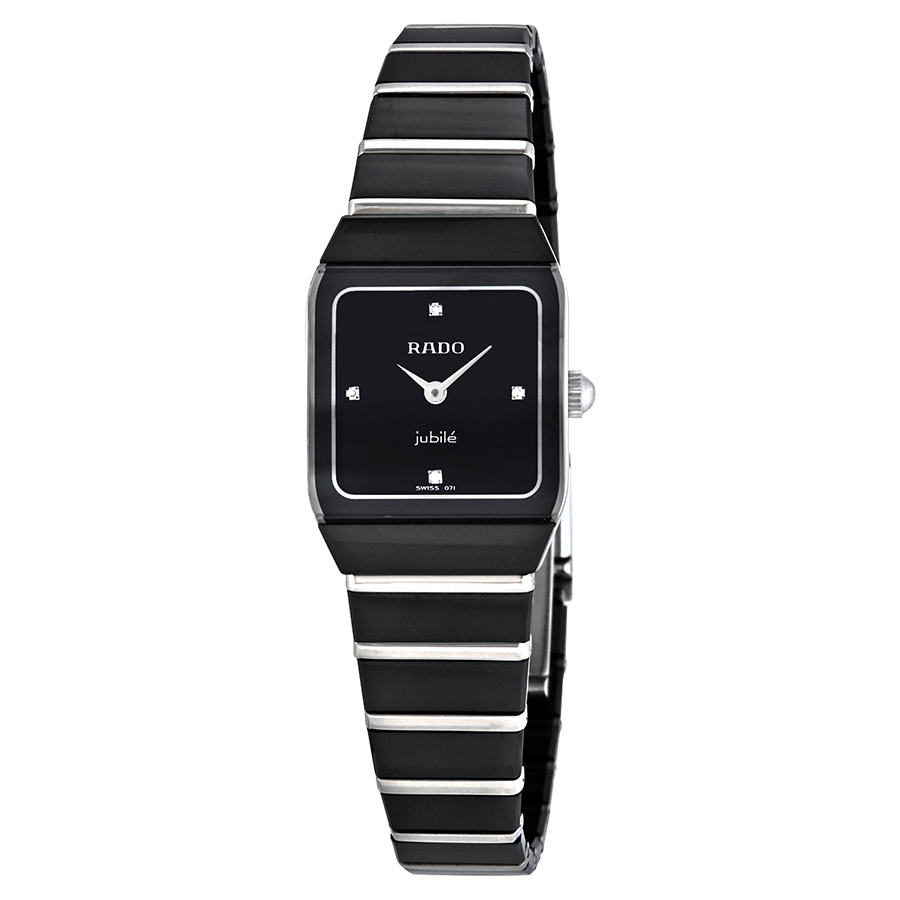Black hardmetal case with a black ceramic bracelet with 18kt white gold bars. Fixed black hardmetal bezel. Black dial with silver-tone hands. Diamonds set at the 3, 6, 9 and 12 o'clock positions. Dial Type: Analog. Quartz movement. Scratch resistant sapphire crystal. Pull / push crown. Solid case back. Square case shape. Case size: 23 mm. Case thickness: 6 mm. Band width: 13 mm. Band length: 6 inches. Fold over clasp. Water resistant at 30 meters / 100 feet. Functions: hour, minute. Anatom Series. Luxury watch style. Watch label: Swiss Made. Rado Anatom Diamond Black Dial Ladies Watch R10464711.