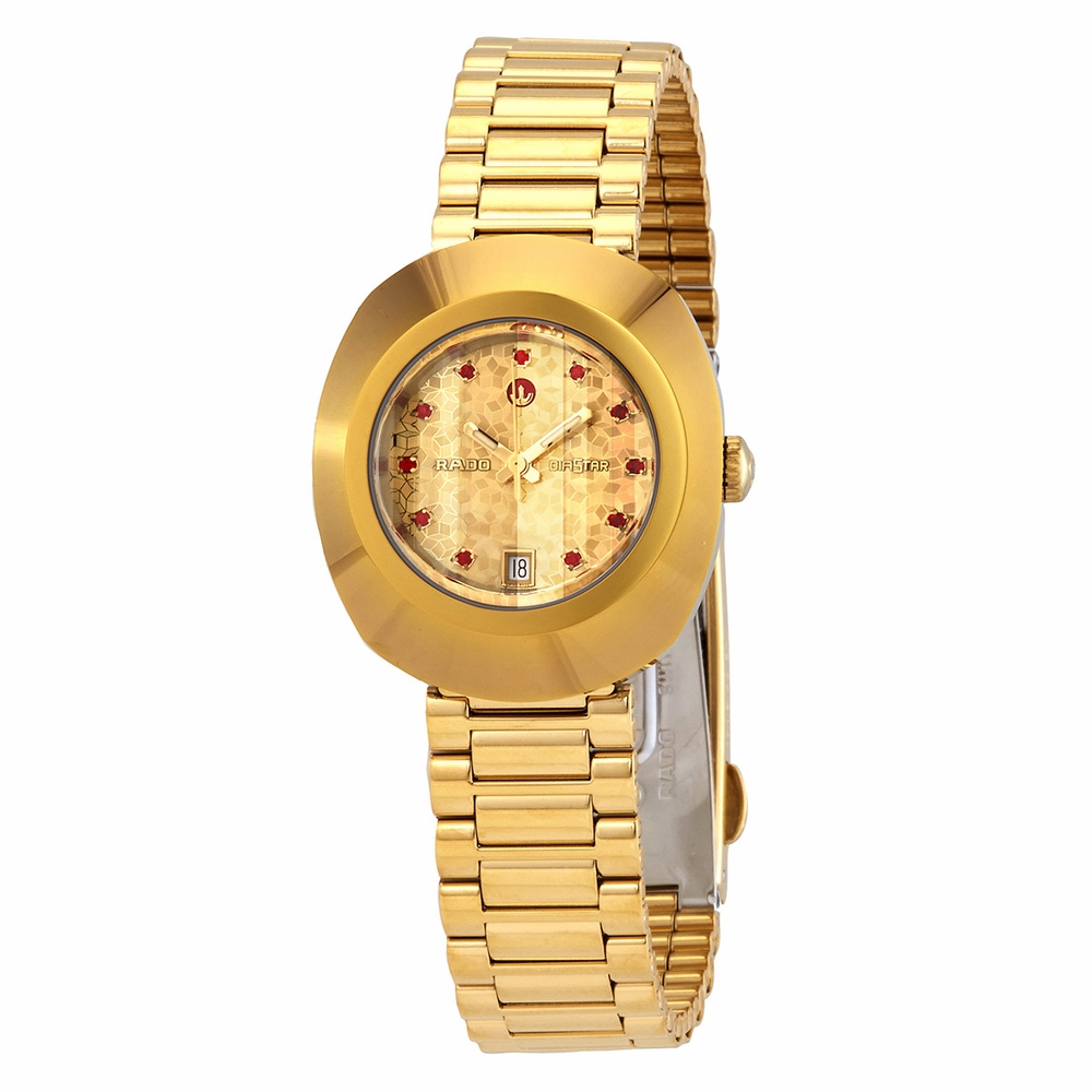 Yellow gold CVD stainless steel case and bracelet. Fixed yellow gold CVD bezel. Yellow gold dial with gold-tone hands and red simili stones hour markers. Dial Type: Analog. Date display at the 6 o'clock position. Rado Calibre 557 automatic movement. Scratch resistant sapphire crystal. Solid case back. Round case shape. Case size: 27.3 mm. Case thickness: 10.7 mm. Fold over clasp with a push button release. Water resistant at 30 meters / 100 feet. Functions: date, hour, minute, second. Original Series. Dress watch style. Watch label: Swiss Made. Rado Original Yellow Gold Dial Automatic Ladies Watch R12416653.
