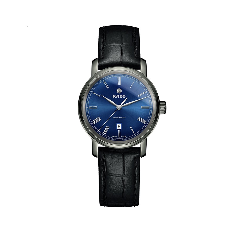Plasma (high-tech) ceramic case with a black leather strap. Fixed plasma (high-tech) ceramic bezel. Blue dial with silver-tone leaf-style hands and Roman numeral hour markers. Minute markers around the outer rim. Dial Type: Analog. Date display above the 6 o'clock position. Rado calibre 580 (ETA 2681) automatic movement, based upon ETA 2681, containing 25 Jewels, bitting at 28800 vph, and has a power reserve of approximately 38 hours. Scratch resistant sapphire crystal. Pull / push crown. Transparent case back. Round case shape. Case size: 33 mm. Case thickness: 9.6 mm. Tang clasp. Water resistant at 50 meters / 165 feet. Functions: date, hour, minute, second. Diamaster Series. Casual watch style. Watch label: Swiss Made. Rado DiaMaster Automatic Blue Dial Ladies Watch R14026205.