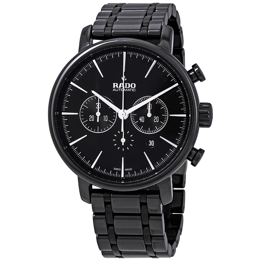 Black (high-tech) ceramic case and bracelet. Fixed black (high-tech) ceramic bezel. Black dial with silver-tone hands and index hour markers. Dial Type: Analog. Date display between the 4 and 5 o'clock positions. ETA caliber 2894-2 automatic movement, based upon ETA 2892-2, containing 37 Jewels, bitting at 28800 vph, and has a power reserve of approximately 38 hours. Scratch resistant sapphire crystal. Pull / push crown. Transparent case back. Round case shape. Case size: 45 mm. Case thickness: 12.6 mm. Band width: 20 mm. Fold over clasp with a push button release. Water resistant at 100 meters / 330 feet. Functions: chronograph, date, hour, minute, second. Diamaster Series. Dress watch style. Watch label: Swiss Made. Rado DiaMaster XXL Automatic Chronograph Black Dial Mens Watch R14075182.
