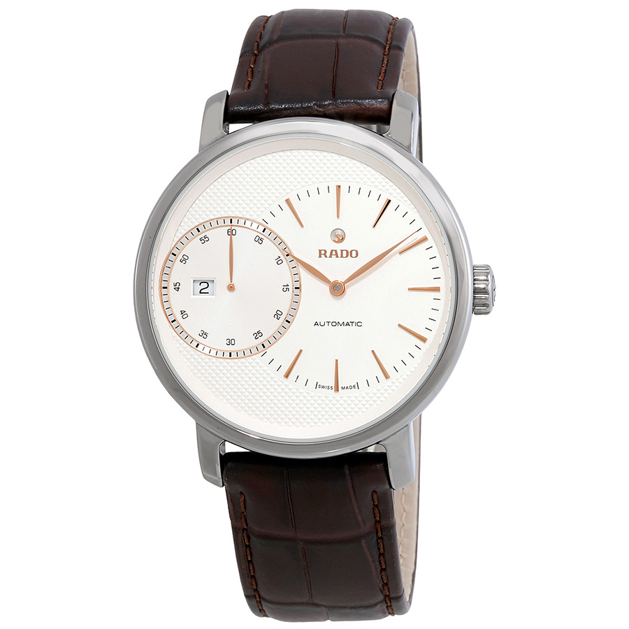 Grey plasma high-tech ceramic case with a dark brown leather strap. Fixed plasma high-tech ceramic bezel. Silver dial with rose gold-tone hands and index hour markers. Minute markers around the outer rim. Dial Type: Analog. Date display at the 9 o'clock position. Large seconds subdials. Rado Calibre 657 automatic movement. Scratch resistant sapphire crystal. Transparent case back. Round case shape, case size: 43 mm, case thickness: 11.8 mm. Tang clasp. Water resistant at 100 meters / 330 feet. Functions: date, hour, minute, second. Dress watch style. Watch label: Swiss Made. Rado DiaMaster XL Silver Dial Automatic Mens Watch R14129116.