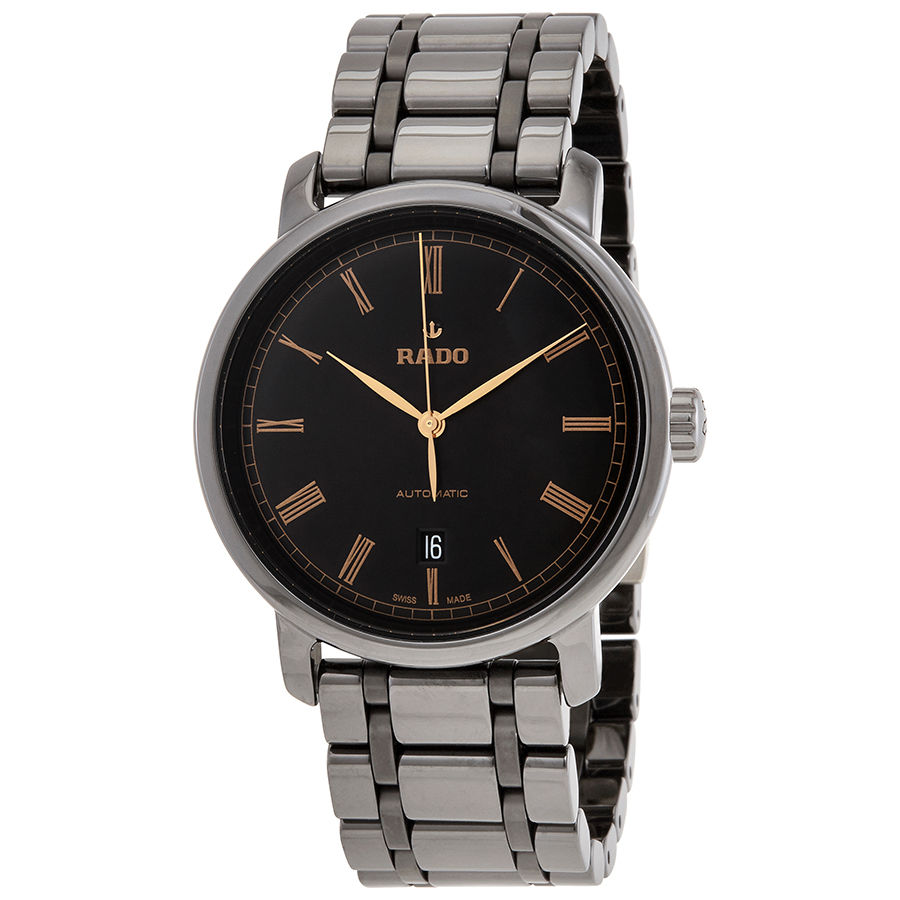 Plasma (high-tech) ceramic case and bracelet. Fixed plasma (high-tech) ceramic bezel. Black dial with rose gold-tone hands and Roman numeral hour markers. Minute markers around the outer rim. Dial Type: Analog. Date display above the 6 o'clock position. Rado calibre 763 (ETA C07.611) automatic movement, based upon ETA C07.611, containing 25 Jewels, bitting at 21600 vph, and has a power reserve of approximately 80 hours. Scratch resistant sapphire crystal. Transparent case back. Round case shape. Case size: 41 mm. Case thickness: 10.2 mm. Band width: 21 mm. Fold over clasp with a push button release. Water resistant at 50 meters / 165 feet. Functions: date, hour, minute, second. Diamaster Series. Dress watch style. Watch label: Swiss Made. Rado DiaMaster Black Dial Automatic Mens Ceramic Watch R14805162.