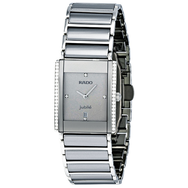 Platinum-tone ceramic case with a platinum-tone ceramic bracelet. Fixed platinum-tone 40 diamond set and ceramic bezel. Grey dial with steel hands and index markers at the quarter hour positions hour markers. Dial Type: Analog. Date display at the 6 o'clock position. Rado Calibre 160 quartz movement. Scratch resistant sapphire crystal. Pull / push crown. Solid case back. Rectangle case shape, case size: 29 mm x 24 mm, case thickness: 6 mm. Band width: 20 mm, band length: 7.5 inches. Hidden push button deployment clasp. Water resistant at 30 meters / 100 feet. Functions: date, hour, minute. Additional Info: date displays at 6 o'clock position. Casual watch style. Watch label: Swiss Made. Rado Integral Quartz Diamond Grey Dial Watch R20429722.