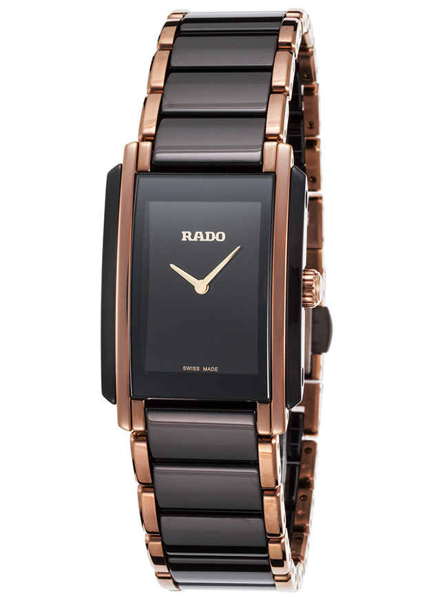 Black high-tech ceramic and rose PVD gold colored case with a two-tone (black and rose gold-tone) high-tech ceramic and rose PVD gold colored bracelet. Fixed bezel. Black dial with rose gold-tone hands. Dial Type: Analog. Quartz movement. Scratch resistant sapphire crystal. Solid case back. Case size: 22 mm. Rectangle case shape. Deployment clasp. Water resistant at 50 meters / 165 feet. Functions: hour, minute, second. Dress watch style. Watch label: Swiss Made. Rado Integral Quartz Black Dial Two-tone Ceramic/Stainless Steel Ladies Watch R20612152.