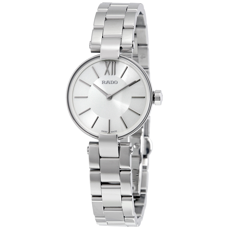 Stainless steel case with a stainless steel bracelet. Fixed stainless steel bezel. Silver dial with silver-tone hands and index hour markers. A Roman numeral appears at the 12 o'clock position. Dial Type: Analog. Quartz movement. Scratch resistant sapphire crystal. Pull / push crown. Solid case back. Case diameter: 27 mm. Case thickness: 7.5 mm. Round case shape. Band width: 17.8 mm. Band length: 7 inches. Deployment clasp. Water resistant at 50 meters / 165 feet. Functions: hour, minute. Dress watch style. Watch label: Swiss Made. Rado Coupole Silver Dial Stainless Steel Ladies Watch R22854013.
