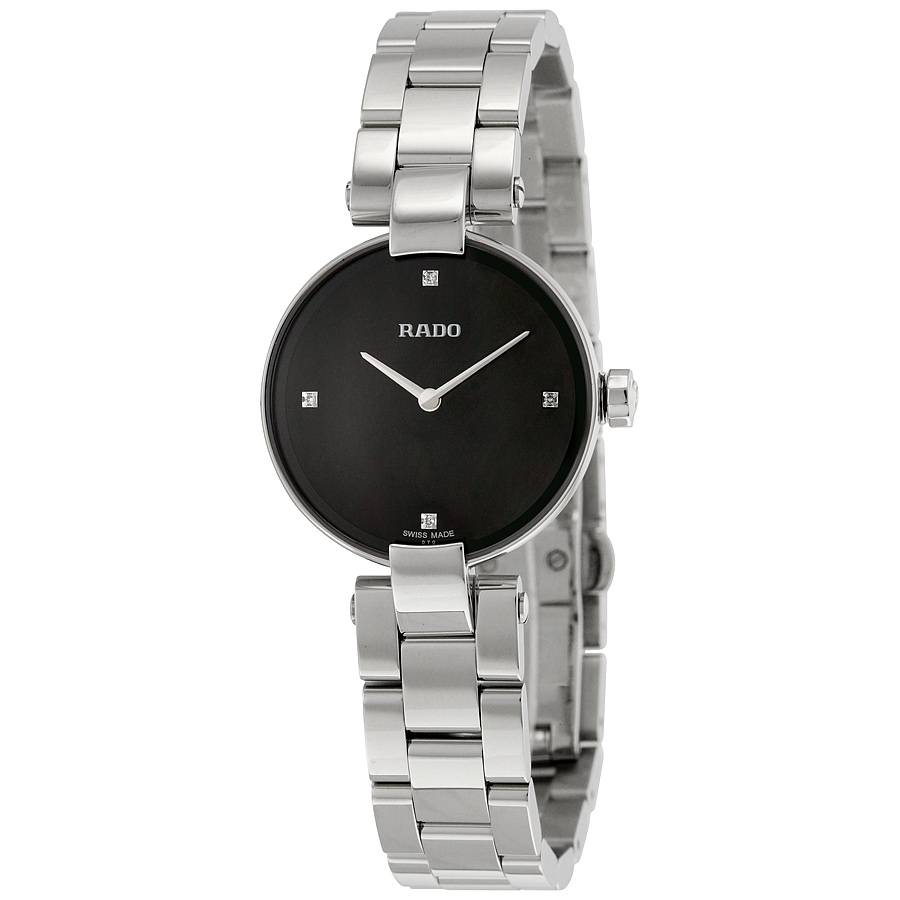 Stainless steel case with a stainless steel bracelet. Fixed stainless steel bezel. Black dial with silver-tone hands. Diamonds mark the 3, 6, 9 and 12 o'clock positions. Dial Type: Analog. ETA Caliber 280.002 quartz movement. Scratch resistant sapphire crystal. Pull / push crown. Solid case back. Round case shape. Case size: 27 mm. Case thickness: 7 mm. Band width: 13 mm. Band length: 7 inches. Fold over clasp with a safety release. Water resistant at 50 meters / 165 feet. Functions: hour, minute. Dress watch style. Watch label: Swiss Made. Rado Coupole Jubilee Black Dial Stainless Steel Ladies Watch R22854703.