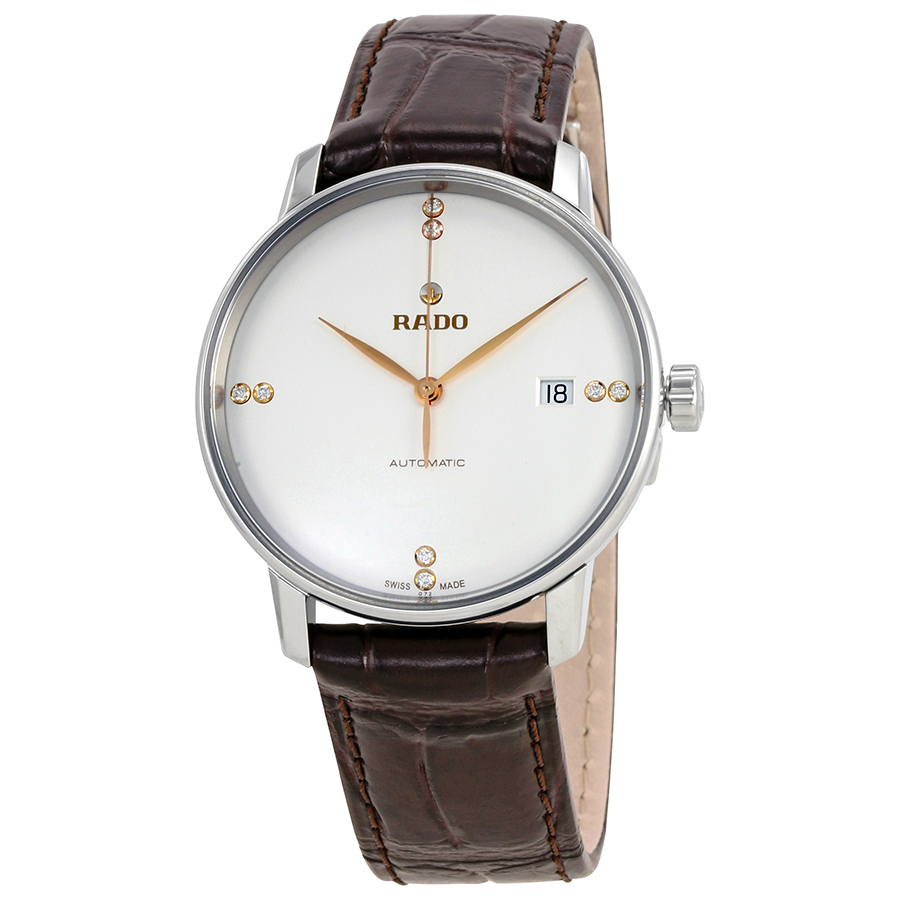 Stainless steel case with a brown leather strap. Fixed stainless steel bezel. White dial with rose gold-tone hands. Diamonds set at the 3, 6, 9 and 12 o'clock positions. Dial Type: Analog. Date display at the 3 o'clock position. Rado calibre 763 (ETA C07.611) automatic movement with an 80-hour power reserve. Scratch resistant sapphire crystal. Transparent case back. Round case shape. Case size: 37.7 mm. Case thickness: 10.2 mm. Band width: 18 mm. Push button clasp. Water resistant at 50 meters / 165 feet. Functions: date, hour, minute, second. Luxury watch style. Watch label: Swiss Made. Rado Coupole Classic Automatic White Dial Mens Watch R22860725.
