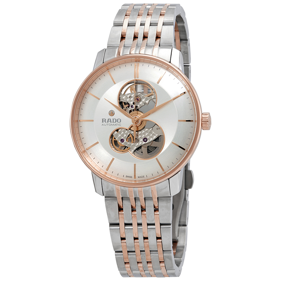 Stainless steel case with a two-tone (silver-tone and rose gold PVD) stainless steel bracelet. Fixed rose gold PVD bezel. Silver (open heart) dial with rose gold-tone hands and index hour markers. Minute markers around the outer rim. Dial Type: Analog. Automatic movement with an 80-hour power reserve. Scratch resistant sapphire crystal. Pull / push crown. Transparent case back. Round case shape. Case size: 41 mm. Case thickness: 11.7 mm. Band width: 22 mm. Fold over clasp. Water resistant at 50 meters / 165 feet. Functions: hour, minute, second. Coupole Classic Open Heart Series. Casual watch style. Watch label: Swiss Made. Rado Coupole Classic Open Heart Automatic Silver Dial Mens Watch R22894023.