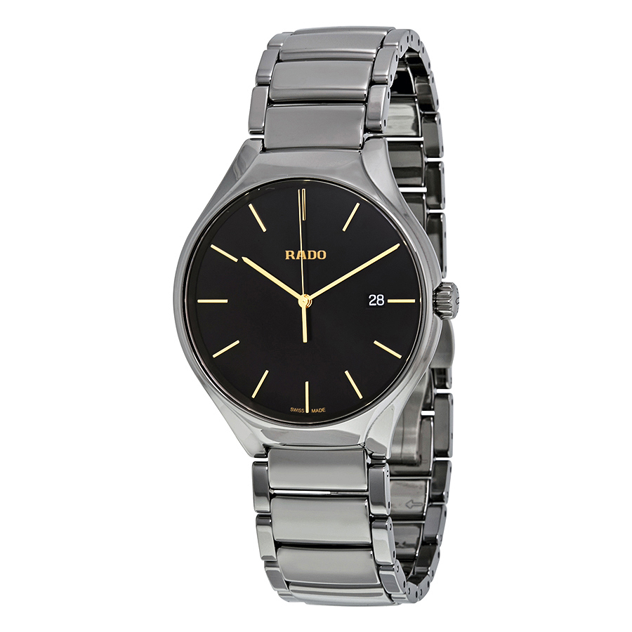High-tech plasma ceramic case and bracelet. Fixed plasma ceramic bezel. Black dial with gold-tone hands and index hour markers. Dial Type: Analog. Date display at the 3 o'clock position. Quartz movement. Scratch resistant sapphire crystal. Pull / push crown. Solid case back. Case size: 40 mm. Round case shape. Deployment clasp. Water resistant at 50 meters / 165 feet. Functions: date, hour, minute, second. Dress watch style. Watch label: Swiss Made. Rado True Black Dial Ceramic Mens Watch R27239152.