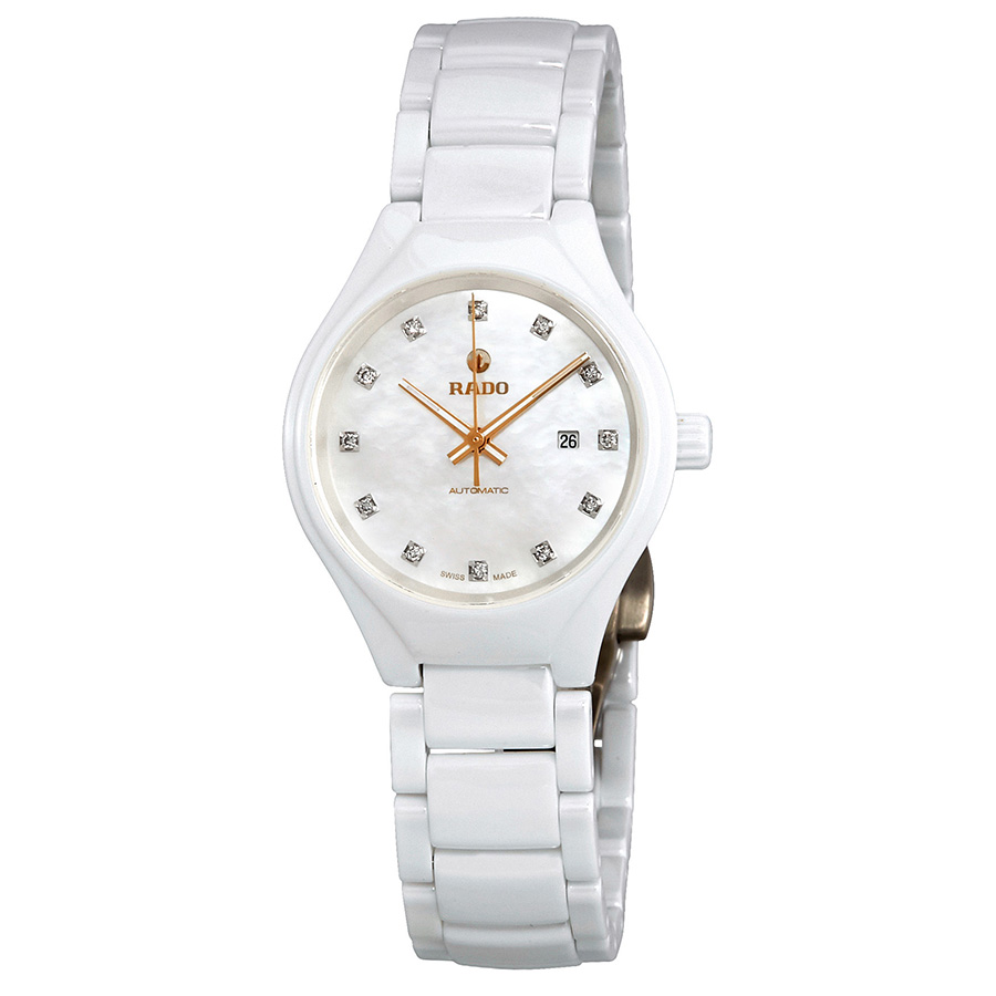 White high-tech ceramic case with a white high-tech ceramic bracelet. Fixed white ceramic bezel. Mother of pearl dial with gold-tone hands and diamond hour markers. Dial Type: Analog. Luminescent hands. Date display at the 3 o'clock position. Rado Calibre 561 (ETA 2671) Automatic movement, based upon ETA 2671, containing 25 Jewels, bitting at 28800 vph, and has a power reserve of approximately 38 hours. Scratch resistant sapphire crystal. Pull / push crown. Solid case back. Round case shape, case size: 30 mm, case thickness: 9.8 mm. Butterfly clasp. Water resistant at 50 meters / 165 feet. Functions: date, hour, minute, second. True Series. Dress watch style. Watch label: Swiss Made. Rado True Automatic Mother of Pearl Diamond Dial Ladies Ceramic Watch R27244902.