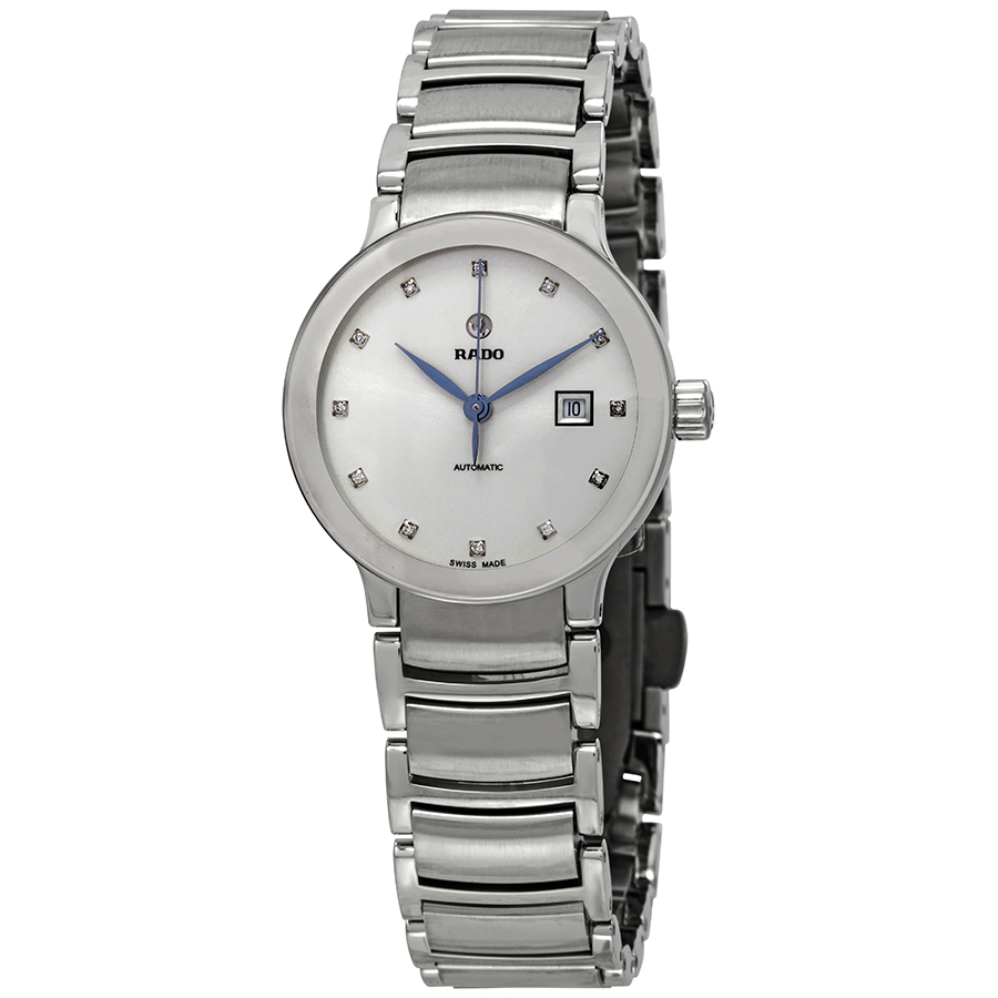 Stainless steel case with a stainless steel bracelet with plasma (high-tech) ceramic inserts. Fixed stainless steel bezel. Silver dial with blue hands and diamond hour markers. Dial Type: Analog. Date display at the 3 o'clock position. Automatic movement. Scratch resistant sapphire crystal. Pull / push crown. Transparent case back. Round case shape. Case size: 28 mm. Case thickness: 6.7 mm. Band width: 15 mm. Fold over clasp with a push button release. Water resistant at 30 meters / 100 feet. Functions: date, hour, minute, second. Additional Info: dial set with 12 diamonds (0.025 carat). Centrix Series. Dress watch style. Watch label: Swiss Made. Rado Centrix Automatic Diamond Silver Dial Ladies Watch R30027733.