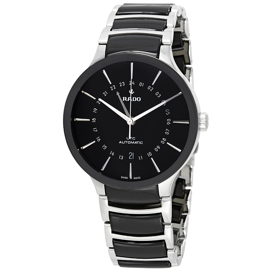 Silver-tone stainless steel case with a two-tone (black and silver-tone) stainless steel with high-tech black ceramic inser bracelet. Fixed black ceramic bezel. Black dial with silver-tone hands and index hour markers. 24 hour markers around an inner ring. Dial Type: Analog. Date display at the 6 o'clock position. Automatic movement. Scratch resistant sapphire crystal. Pull / push crown. Transparent case back. Round case shape, case size: 40 mm, case thickness: 12.3 mm. Water resistant at 30 meters / 100 feet. Functions: GMT, second time zone, hour, minute, second, date. Centrix Xl Series. Dress watch style. Watch label: Swiss Made. Rado Centrix XL Automatic Black Dial Mens Watch R30166152.