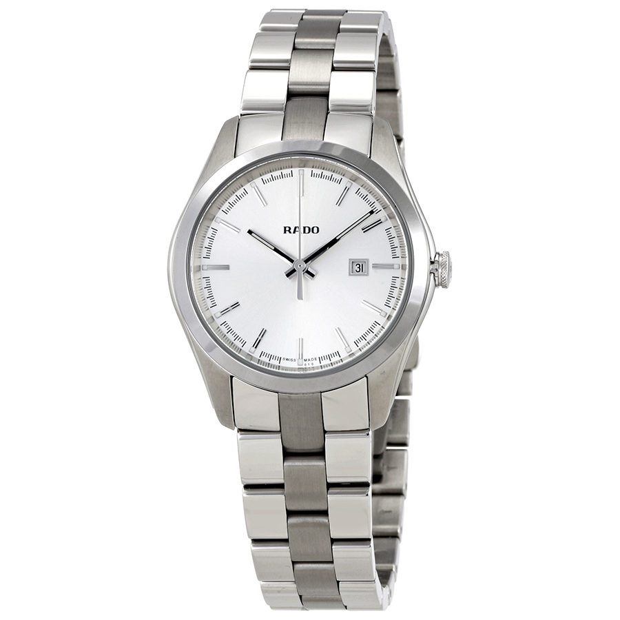 Stainless steel case with a stainless steel bracelet. Fixed silver-tone ceramos bezel. Silver dial with luminous silver-tone hands and index hour markers. Minute markers around the outer rim. Dial Type: Analog. Luminescent hands and markers. Date display at the 3 o'clock position. Quartz movement. Scratch resistant sapphire crystal. Pull / push crown. Solid case back. Round case shape. Case dimensions: 31 mm x 37 mm. Case thickness: 9 mm. Band width: 15 mm. Band length: 7 inches. Fold over clasp with a push button release. Water resistant at 50 meters / 165 feet. Functions: date, hour, minute, second. Dress watch style. Watch label: Swiss Made. Rado HyperChrome Silver Dial Ladies Watch R32110103.