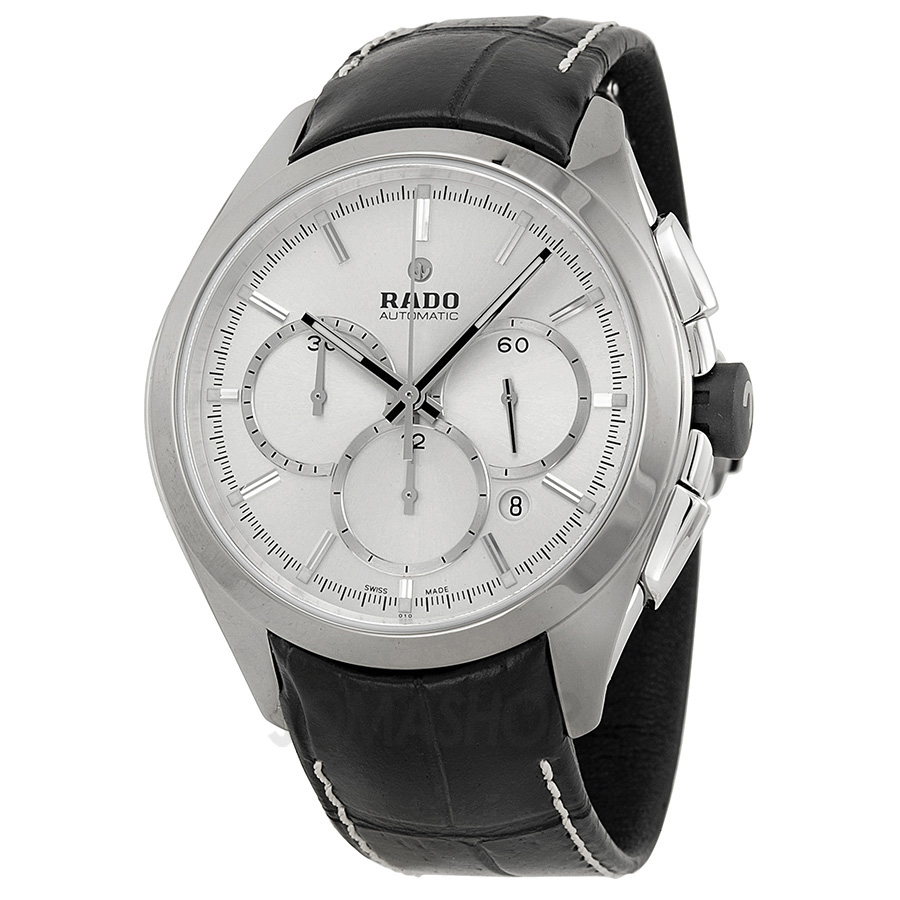 Plasma (high-tech) ceramic case with a black leather strap. Fixed plasma (high-tech) ceramic bezel. Black dial with luminous silver-tone hands and index hour markers. Minute markers around the outer rim. Dial Type: Analog. Luminescent hands and markers. Date display between the 4 and 5 o'clock positions. Chronograph - three sub-dials displaying: 60 second, 30 minute and 12 hour. ETA caliber 2894-2 automatic movement, based upon ETA 2892-2, containing 37 Jewels, bitting at 28800 vph, and has a power reserve of approximately 38 hours. Scratch resistant sapphire crystal. Screw down crown. Transparent case back. Round case shape. Case size: 45 mm. Case thickness: 13 mm. Band width: 21 mm. Tang clasp. Water resistant at 100 meters / 330 feet. Functions: chronograph, date, hour, minute, second. Dress watch style. Watch label: Swiss Made. Rado Hyperchrome Automatic Silver Dial Black Leather Mens Watch R32276105.