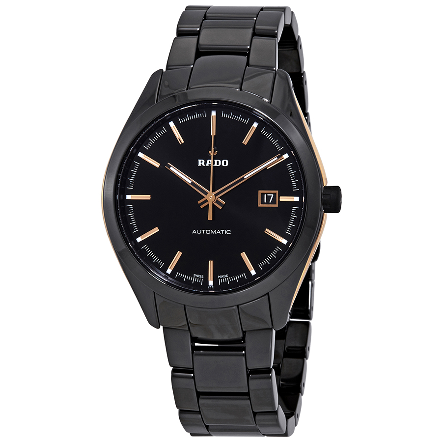 Black (high-tech) ceramic case with a black (high-tech) ceramic bracelet. Fixed (high-tech) ceramic bezel. Black dial with luminous rose gold-tone hands and index hour markers. Minute markers around the outer rim. Dial Type: Analog. Date display at the 3 o'clock position. Automatic movement. Scratch resistant sapphire crystal. Transparent case back. Round case shape. Case size: 42 mm. Case thickness: 10.2 mm. Band width: 20 mm. Water resistant at 100 meters / 330 feet. Functions: date, hour, minute, second. Hyperchrome Series. Dress watch style. Watch label: Swiss Made. Rado Hyperchrome XL Black Automatic Dial Mens Watch R32291152.