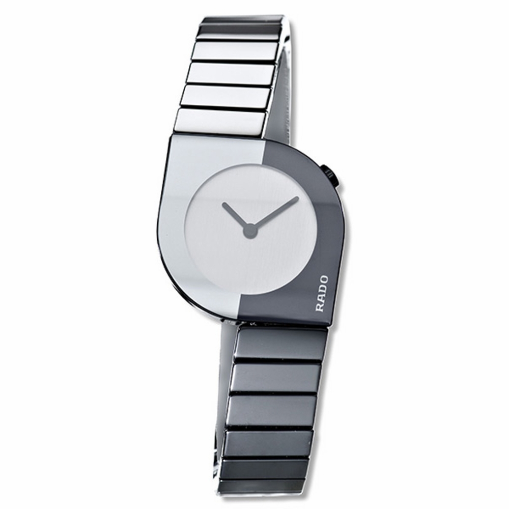 Black and gray ceramic case and bracelet. Fixed ceramic bezel. Silver dial with grey hands. No markers. Battery powered Swiss quartz movement. Scratch resistant sapphire crystal. Screw-in closed case back. Case diameter: 24 mm. Case thickness: 7.5 mm. Deployment with push button release clasp. Water resistant at 30 meters / 100 feet. Rado Womens Cerix Mini Watch R25473102.