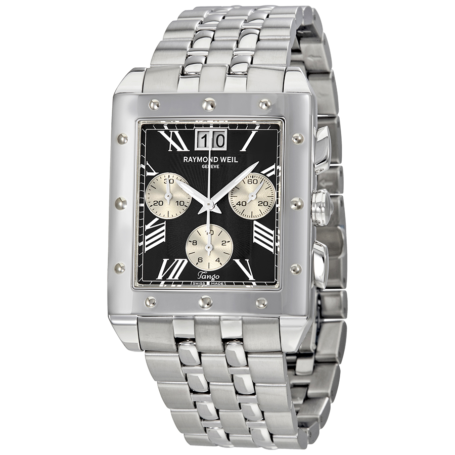 Silver-tone stainless steel case with a silver-tone stainless steel bracelet. Fixed silver-tone stainless steel bezel. Black dial with silver- tone hands and Roman numeral hour markers. Minute markers around the outer rim. Dial Type: Analog. Luminescent hands and markers. Date display at the 12 o'clock position. Chronograph - three sub-dials displaying: 60 second, 30 minute and 1/10th of a second. Quartz movement. Scratch resistant sapphire crystal. Pull / push crown. Solid case back. Rectangle case shape, case size: 36 mm x 34 mm, case thickness: 10.15 mm. Band width: 23 mm. Deployment with push button release clasp. Water resistant at 50 meters / 165 feet. Functions: chronograph, date, hour, minute, second. Casual watch style. Watch label: Swiss Made. Item Variations: 4881 ST 00209, 4881.ST.00209, 4881ST00209. Raymond Weil Tango Mens Watch 4881-ST-00209.