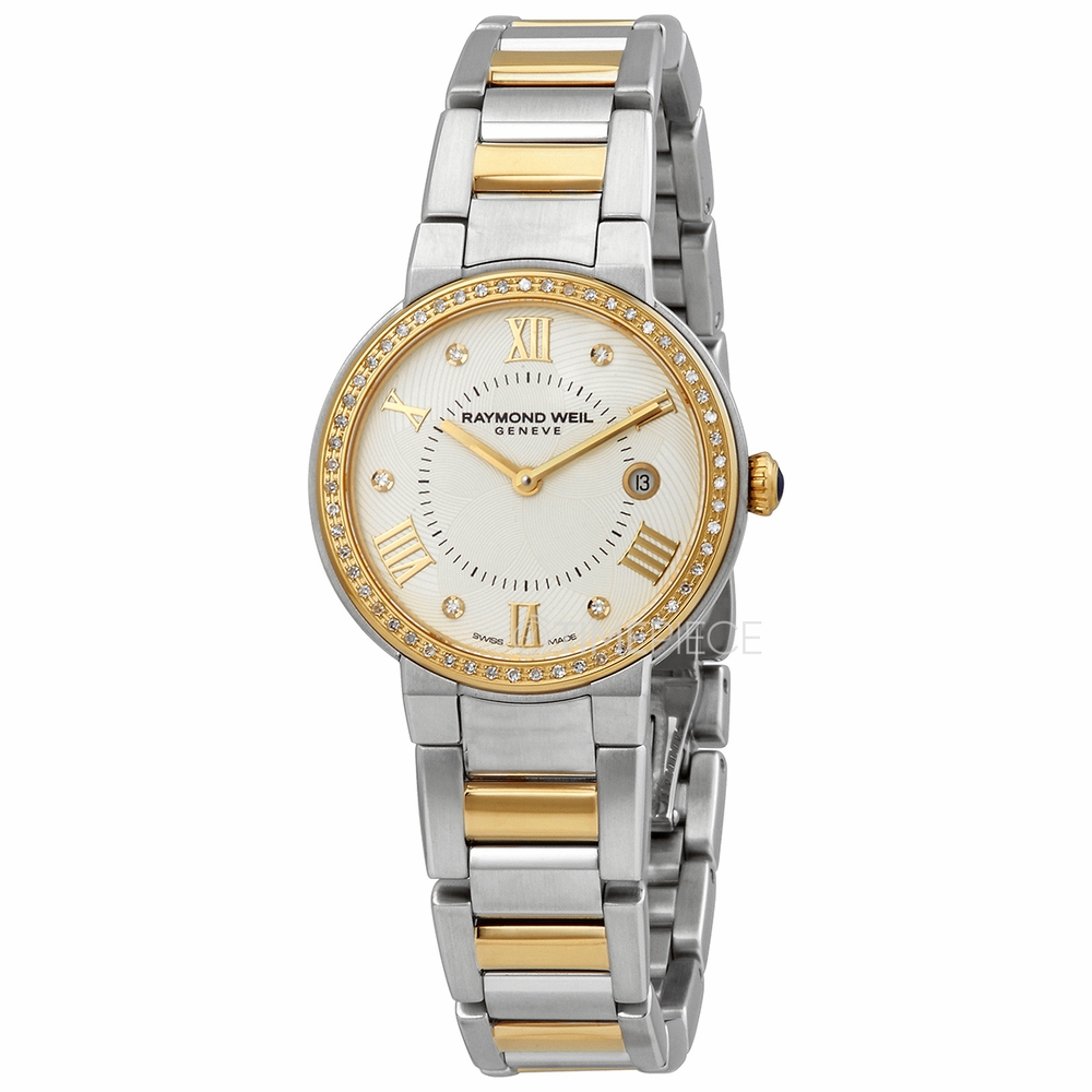Silver-tone stainless steel case with a two-tone (silver-tone and yellow gold-tone) stainless steel bracelet. Fixed yellow gold-tone bezel with diamond set. Silver dial with yellow gold-tone hands and alternating Roman numeral and diamond hour markers. Minute markers around an inner ring. Dial Type: Analog. Date display at the 3 o'clock position. Quartz movement. Scratch resistant sapphire crystal. Pull / push crown. Solid case back. Round case shape, case size: 30 mm. Fold over clasp with a push button release. Water resistant at 50 meters / 165 feet. Functions: date, hour, minute. Jasmine Series. Dress watch style. Watch label: Swiss Made. Raymond Weil Jasmine Quartz Diamond Silver Dial Ladies Watch 5240-SPS-00665.
