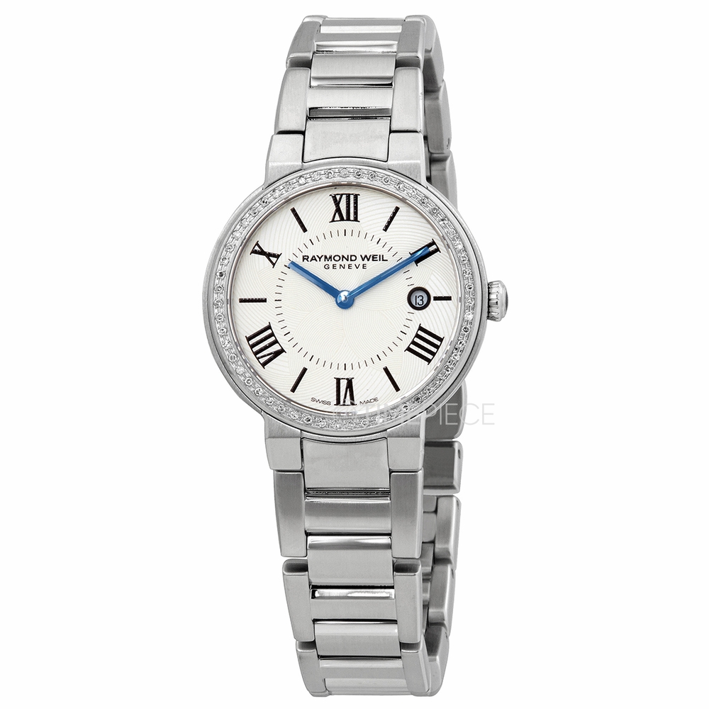 Silver-tone stainless steel case and bracelet. Fixed silver-tone bezel with diamond set. Silver dial with blue hands and alternating Roman numeral and index hour markers. Minute markers around an inner ring. Dial Type: Analog. Date display at the 3 o'clock position. Quartz movement. Scratch resistant sapphire crystal. Pull / push crown. Solid case back. Round case shape, case size: 30 mm. Fold over clasp with a push button release. Water resistant at 50 meters / 165 feet. Functions: date, hour, minute. Jasmine Series. Dress watch style. Watch label: Swiss Made. Raymond Weil Jasmine Quartz Diamond Silver Dial Ladies Watch 5240-STS-00661.